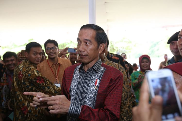 KOMPAS.com / ANDREAS LUKAS ALTOBELI Warga menyambut Presiden Republik Indonesia Joko Widodo (Jokowi) saat tiba di acara penyerahan sertifikat tanah di Serpong, Tangerang…